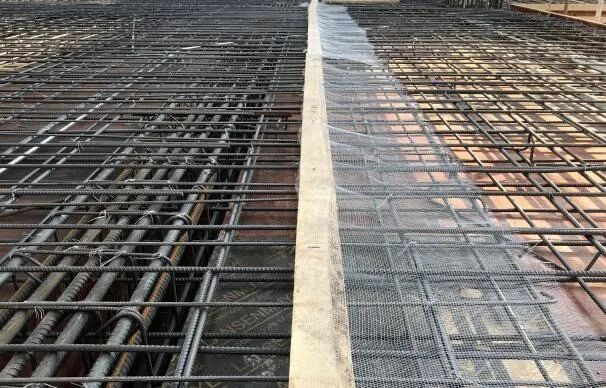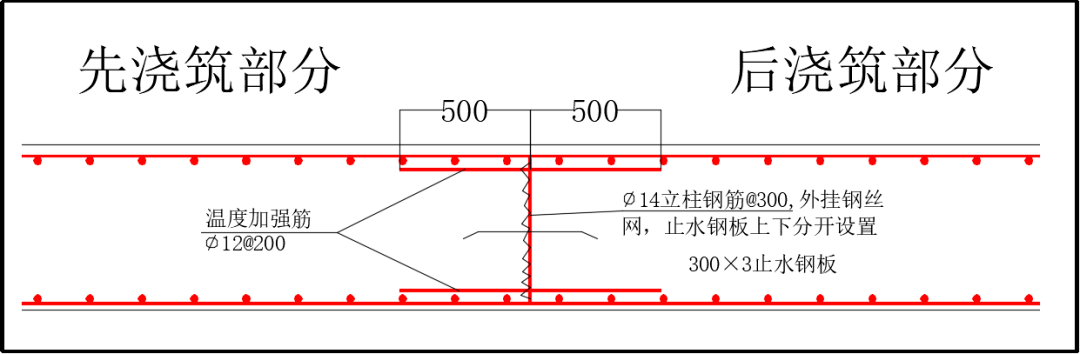 该工程地下室长240M、宽220M、顶板厚30CM、底板厚40CM,桩基承台厚度分别为1.2~1.8M,占地下室底板70%的面积。面对超长超宽超厚的钢筋混凝土结构,荣建集团项目部采用“跳仓法”施工,将整个地下室底板和顶板划分成6X6的36个方块,设定了7天的跳仓间隔期,依靠7天后已形成的混凝土自身抗拉强度抵抗相邻新混凝土板块的温度收缩应力,经短期应力释放后,再将整个小块体连成整体,符合了抗放兼施、先放后抗、以抗为主的施工原理。在关键防渗漏的施工缝构造处理上,除了预埋止水钢板,我司项目部还设置了超前止水构造,在外墙、底板的施工缝处均做防水附加层,每道施工缝均在断面处加设钢筋焊接网架,以支持双层密目钢丝网,并增设温度应力加强筋。在砼浇筑作业过程中,对施工缝加强了二次振捣,二次抹面,保温保湿养护14天。采用跳仓法工艺避免了后浇带,取得了良好的裂缝控制效果,获得工期短,投资低,施工方便,质量可靠等经济效益。 (顶板跳仓施工) (底板施工缝节点) |